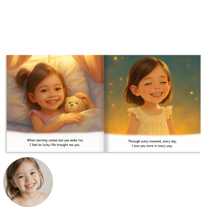 You simply upload your child’s photo and enter their name. We transform their face, skin tone, and hairstyle into a beautifully illustrated version that appears throughout the story.