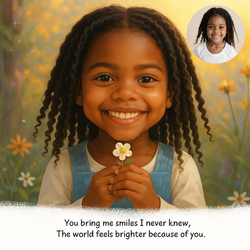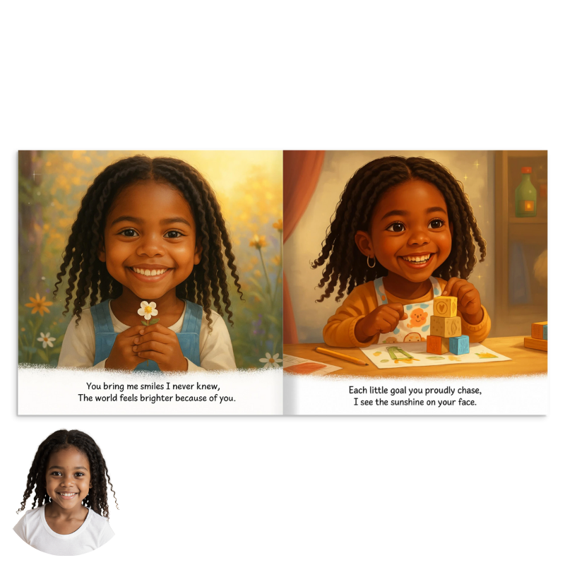 Choose a clear, front-facing photo with good lighting where your child’s face is fully visible. No filters or sunglasses. Please ensure their hair is down and not tied up, so we can accurately match their hairstyle in the illustrations. The better the photo, the better the final result.